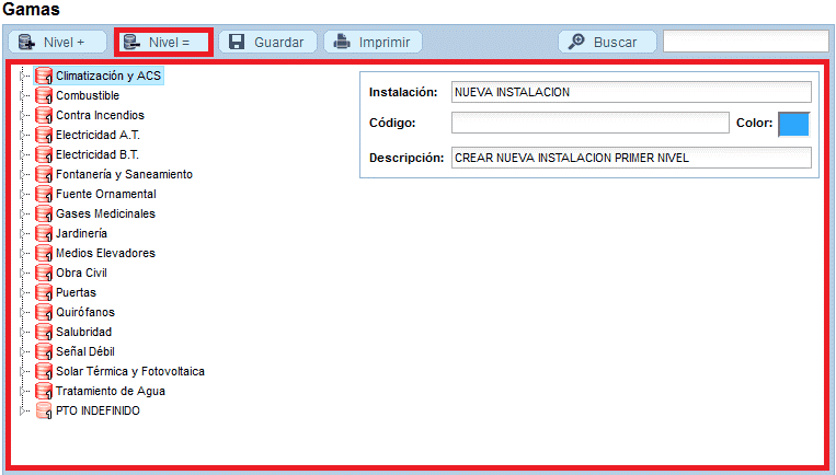 Para crear una nueva gama (nivel 2), bastará con pulsar sobre “Nivel +” sobre la Instalación deseada en el nivel 1 y aparecerá el formulario que se cumplimentará con el nombre de la nueva gama que se ha de crear.
